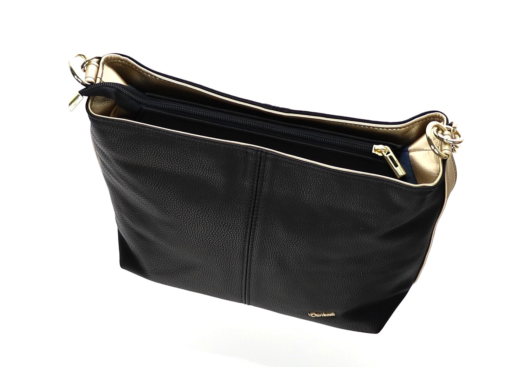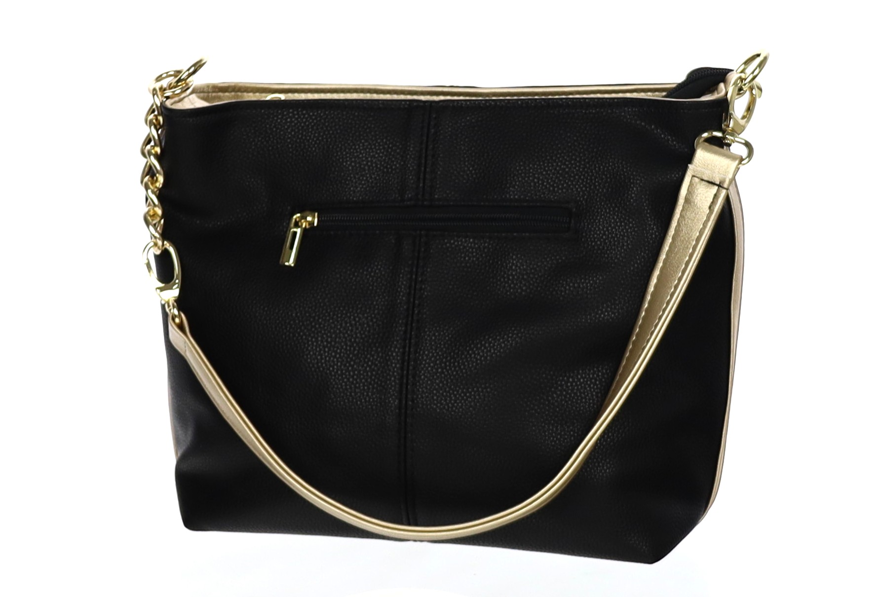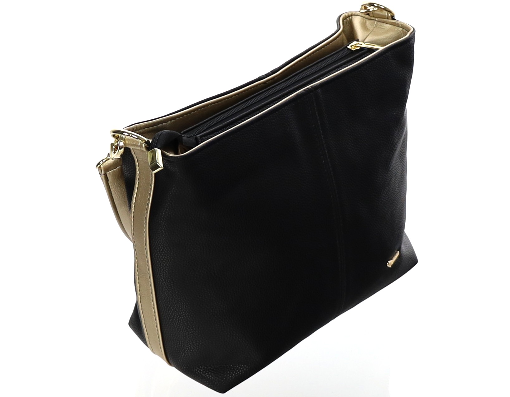Torebka na ramię i do ręki, w środku dwie komory, trzy kieszonki w środki i jedna z tyłu torebki, dodatkowo długi regulowany pasek, wymiary szer.37cm; wys.26cm; szer.dna14cm;
