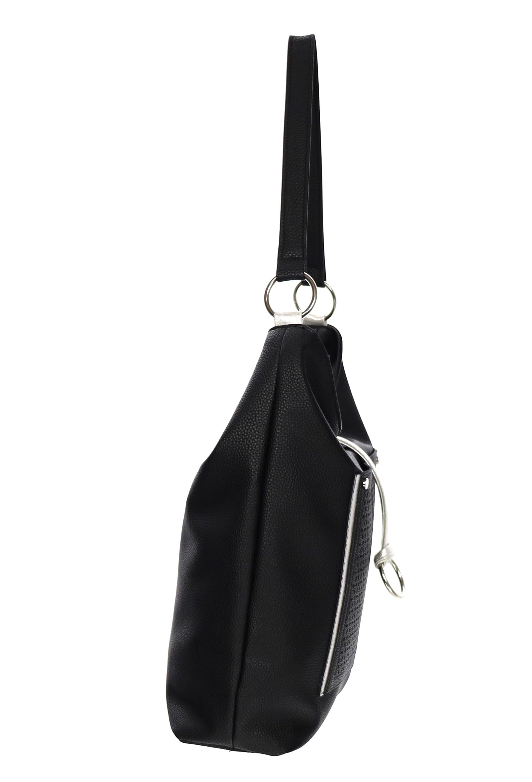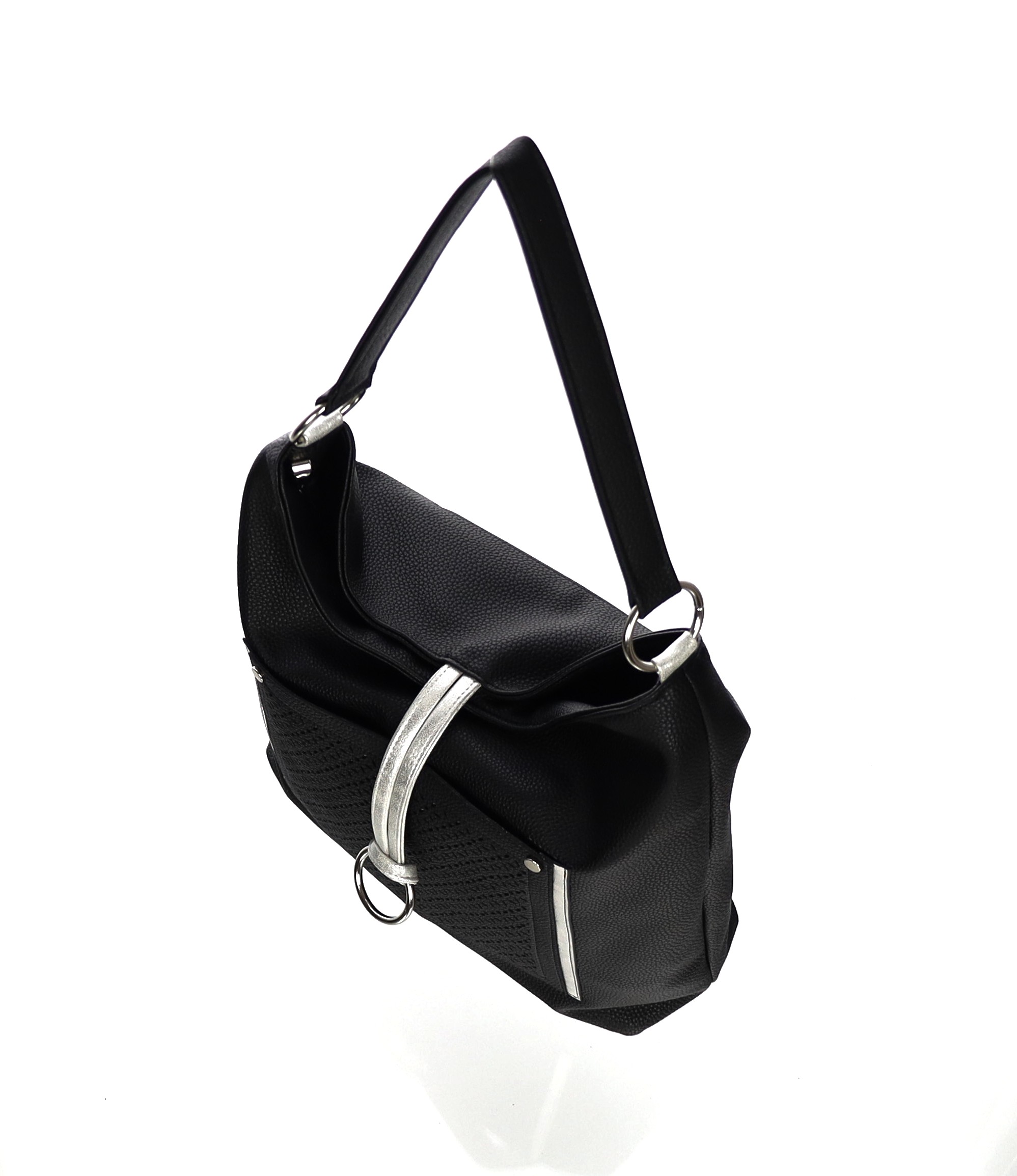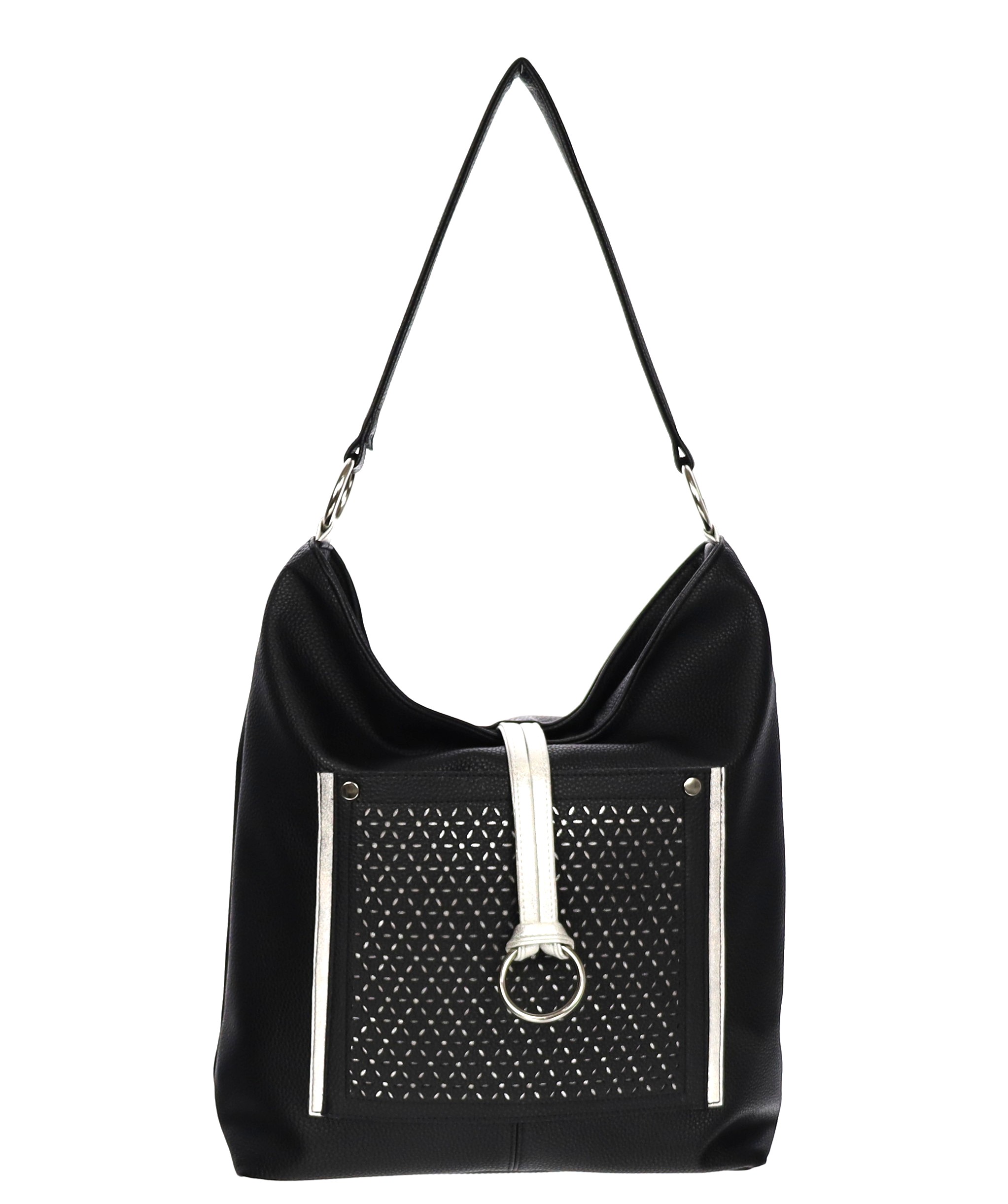 Duża torebka typu worek, bardzo pojemna, na ramię dodatkowo długi regulowany pasek, w środku dwie komory, trzy kieszonki w tym dwie na zamek , z tyłu torebki kieszonka np. na klucze, z przodu kieszonka ozdobiona oryginalnym wzorem.